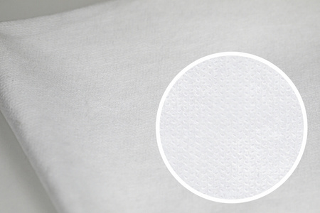 100% polipropylen (włóknina), 60g/m2 (+- 5%), struktura delikatnie porowata, zapewnia dobrą cyrkulację powietrza, co wspomaga w utrzymaniu higieny i termicznego komfortu podczas użytkowania